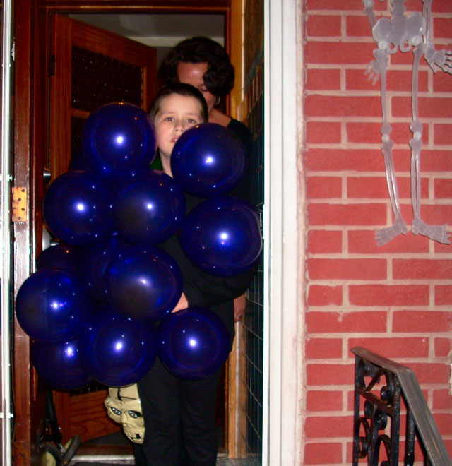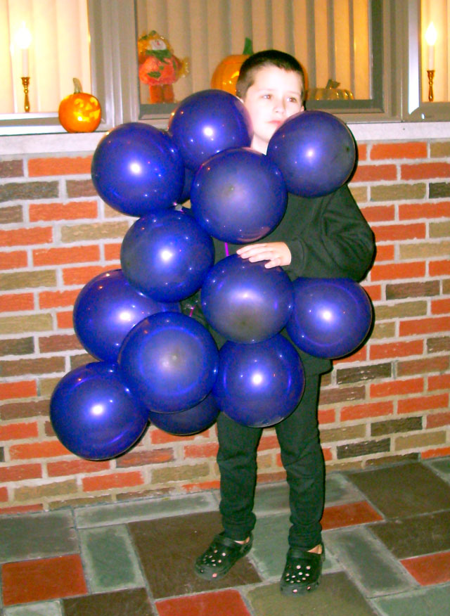 One of my most ingenious, well received Halloween costumes cost less than five dollars to make. You don’t have to spend a fortune on a costume – all you need are some balloons, safety pins, two pieces of felt, and a really good friend to help you blow up the balloons!
