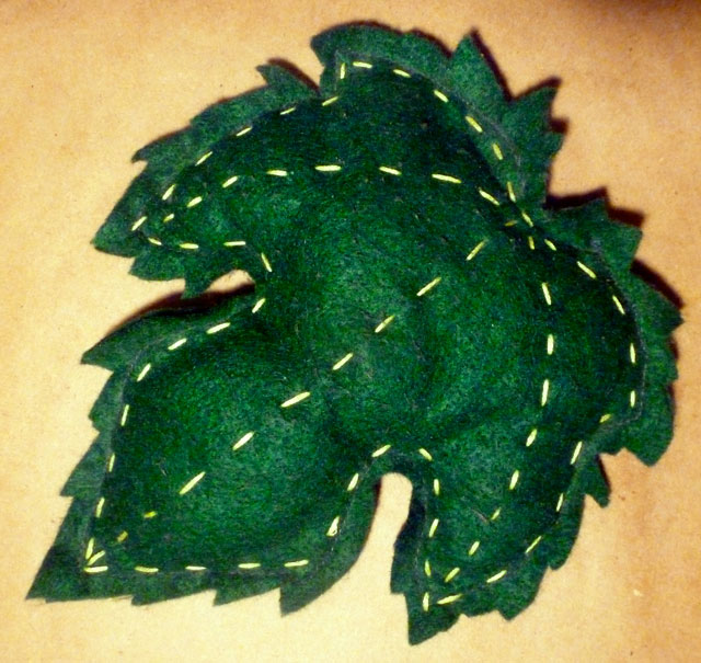 I pinned the two pieces of felt together and cut them out. I used the embroidery thread to stitch them together, leaving a two inch opening at the bottom for the stuffing – I used cotton balls – but you can use almost anything. I closed up the hole, and did some simple decorative stitches to make it look more grape leafy-like. Pin the leaf on the child’s shoulder.