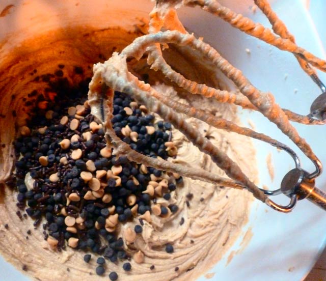 3. Cream butter and both sugars. Add egg and vanilla, then mix in peanut butter. With the mixer on a low speed, add the flour mixture. Then fold in the Reese’s Peanut Butter Dessert Toppings.