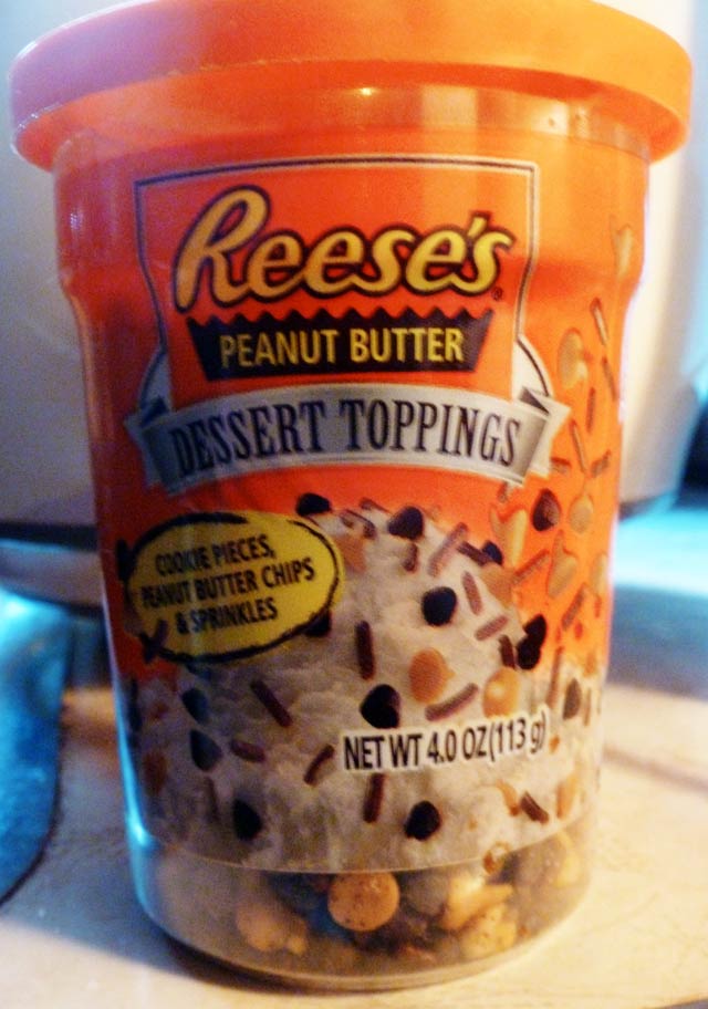 I was going to make something pumpkin, being that it’s Halloween week – but Hurricane Sandy put the kibosh on that. There was no way I was going to brave the supermarkets with the crazed people who buy out the bread aisle, and load up on as many eggs and gallons of milk as they can carry. So instead, I looked around my pantry for inspiration. I decided on peanut butter cookies with chocolate chips to get us through the storm, unfortunately we were all out of chocolate chips. I did, however, find a container of Reese’s Peanut Butter Dessert Toppings – mini cookie pieces and peanut butter chips with jimmies. I think I bought them as a cupcake topper and forgot I had them – I decided to use them, because when the National Weather Service says you’re about to be pummeled with 100 MPH winds and rain – it’s best to improvise!