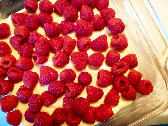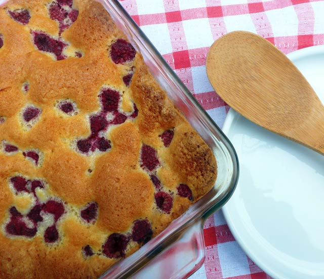 3. Pour the batter into a buttered 8″ x 8″ baking dish. Sprinkle the raspberries on top and bake for 50 – 55 minutes. Test with a toothpick. Serves 5 – 6.