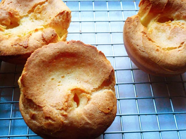 5. Remove from oven, take the popovers out of the pan and place on a wire rack. Pierce the bottoms with a knife so the steam escapes. Serve immediately.