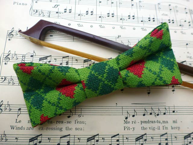 My son’s Christmas concert is coming up, and I thought I’d make him a new bow tie for the occasion. I found the fabric and snapped it up immediately. I love the red and green argyle, but the faux knit pattern was what really sold me! If you’re interested in making one, there’s a tutorial here.
