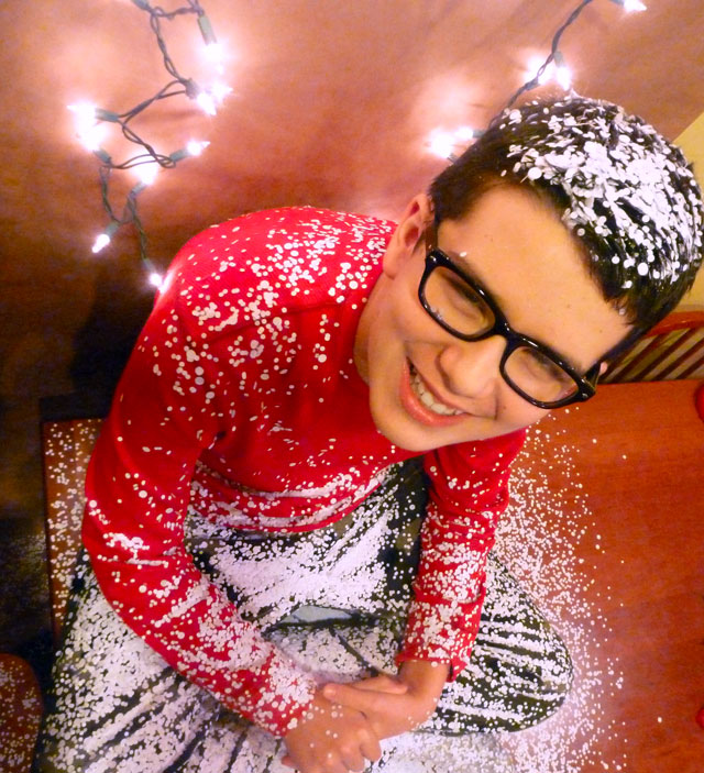 First of all, Lloyd is the boy with a thousand cowlicks! Those cowlicks needed to be tamed by a dollop of hair gel. Second, the falling snowflake effect wasn’t working due to the fact that the camera wasn’t fast enough. The gel in Lloyd’s hair acted like an adhesive to the white confetti we were sprinkling overhead. Joe and I took turns shooting dozens of photos and the confetti was everywhere!