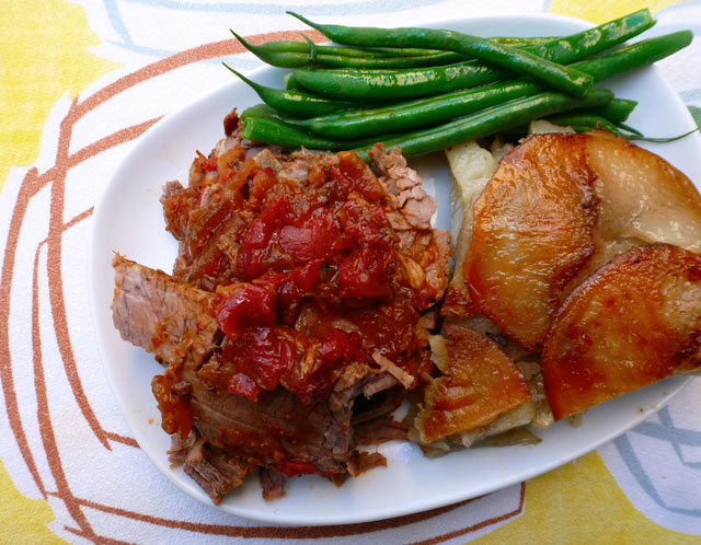 My introduction to brisket was years ago during a staff dinner at a restaurant I was working in during Passover. It was love at first bite – so tender that you could cut it with a fork in a pool of brown gravy with onions, chopped tomatoes, and lots of garlic. I made one last weekend and paired it with a French gratin potato cake and haricot verts. It’s also pretty amazing served over egg noodles or couscous, not to mention the sandwiches…..