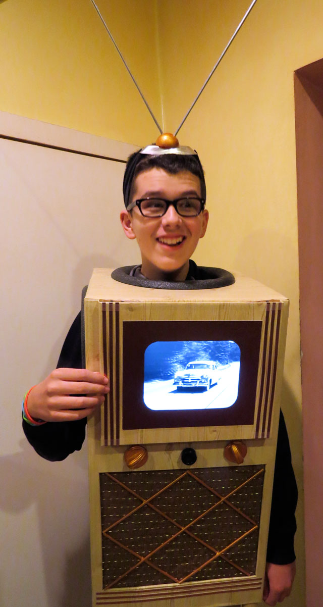 When Joe proposed making a vintage TV costume, initially, I wasn’t so hot on the idea. It didn’t seem as exciting as the Pinball Machine, the Fortune Teller, or the Seeburg Jukebox. Then I began to think about the first TV I can remember in my parent’s living room – it had a blonde cabinet, sparkly fabric covering the speaker, and legs similar to the ones on our boomerang coffee table, I began to think this idea definitely had possibilites!
