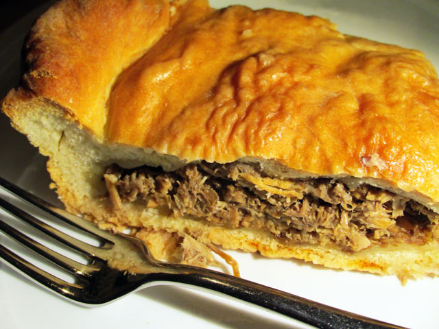 Punch dough down, on a lightly floured surface, take 2/3 of the dough and roll out until it’s big enough to fit in an 9″ x 13″ greased pan and up over the sides. Fill with cooled meat mixture. Roll out remaining dough, cover, fold under bottom crust and pinch together. Cut five slits in top crust to let steam escape. Bake at 350º for one hour.