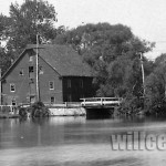 Almonesson was originally known as Lambtown, named for Daniel Lamb, who constructed a cotton factory powered by a lake he created by damming the Almonesson Creek. He also constructed a one-story brick store at the site. During a spring freshet in March 1845, the dam burst and the ensuing torrent washed the mill away. Subsequent to this occurrence, Joseph Carrow purchased the mill seat and constructed a gristmill, but, this mill, like the cotton factory, was washed away by another freshet and dam failure in 1866. The partnership of G.D. Carman and Chalkley Ambler bought the mill seat and built the gristmill shown in Willceau’s photograph. The town changed its name to Almonesson when the United States Post Office Department opened the Almonesson Post Office in June 1872.