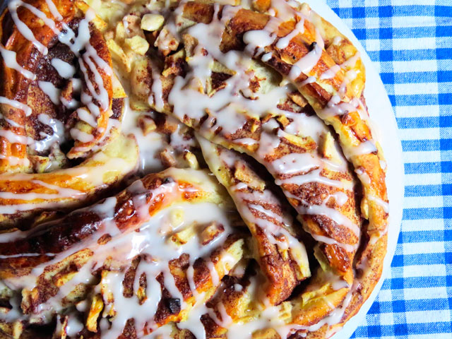 5. When the dough has doubled in size, remove from bowl and knead a few times. On a lightly floured surface, roll into a 12″ x 18″ rectangle. Spread the cinnamon filling over the dough, leaving a 1″ border around the edges. Sprinkle the apples and pears over the cinnamon mixture.