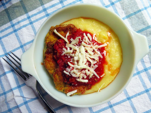 Polenta and eggplant parmesan is cold weather comfort food at it’s finest. Creamy polenta paired with meaty eggplant topped with a spicy tomato gravy and mozzarella – it’s good stuff!