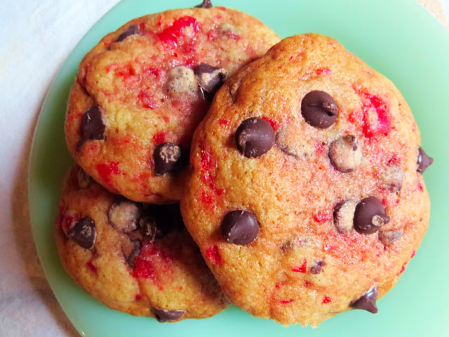 Valentine’s Day is right around the corner, and I can’t think of a better way to say “I dig you”, than baking a batch of these big, soft, chocolate chip cherry cookies for your significant other. No significant other? No problem! Make ’em anyway and share them with the mailman or your neighbors – just be sure to set aside a few for yourself!