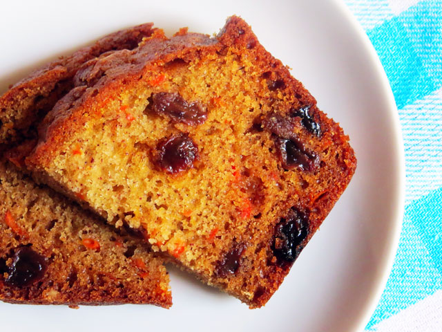 I adore this bread – it’s sweet, but not too sweet. Perfect with coffee in the morning, flecked with shredded carrots and dotted with raisins. It makes getting out of bed on these last cold days of winter bearable!