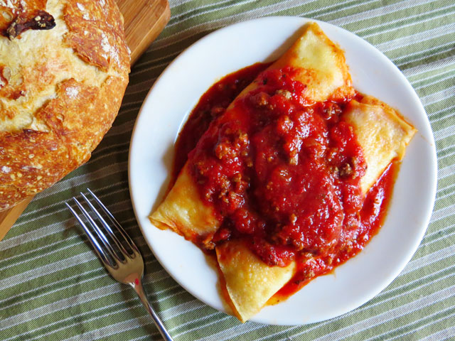 Making manicotti has been on my “things I want to make” list for a long time and have successfully avoided doing until now. I don’t know why – it’s pretty easy if you make the crepes one day and stuff them the next. This recipe makes enough to freeze for a future dinner. Take the plunge and serve with some No-Knead Bread!