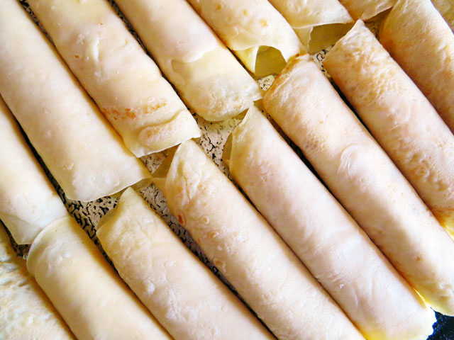 - Place the filled crepes, seam side down in pan, cover with more sauce. Bake for 30 minutes.