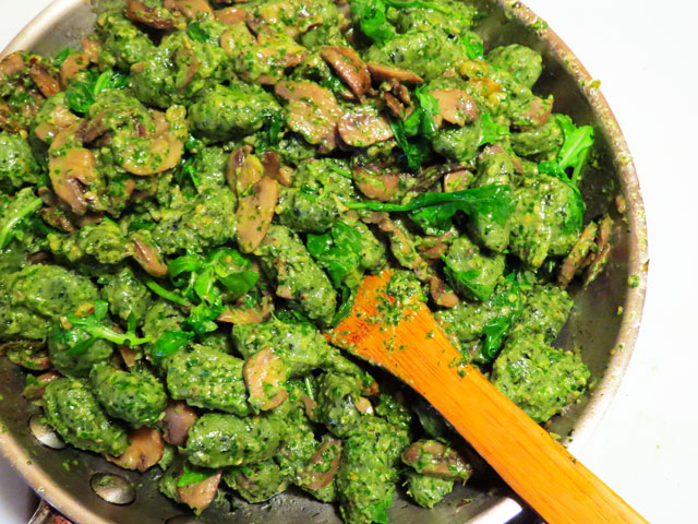 - Add gnocchi to pan with mushrooms, add the pesto – stir to coat. Add reserved arugula, stir until it wilts, serve.