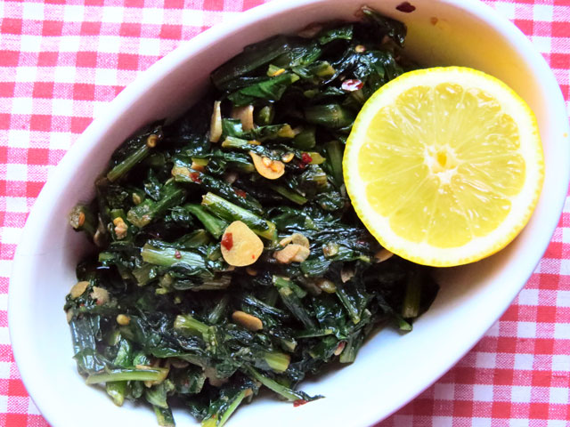 The boy and I were on our usual Saturday jaunt on 9th Street to shop for dinner and pick up lunch at Lorenzo’s. We were on the lookout for asparagus, when we stopped at Pat and Larry’s stand. They had fat bundles of dandelion greens that looked good enough for us to change our minds about the asparagus. Some olive oil, thinly sliced garlic (think Paul Sorvino in “Goodfellas”), half a lemon, and crushed red pepper in a sauté pan and you’re good to go!