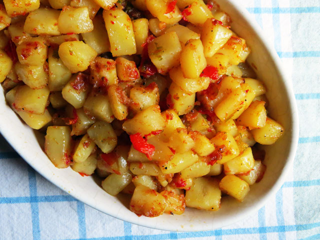Potatoes O’Brien are potatoes, pan fried with red and green peppers, onion, and garlic. This dish is said to have been invented in the early 1900s, with a dispute that the recipe originated at Boston restaurant Jerome’s or possibly Jack’s in Manhattan. It is thought to be named for William Smith O’Brien, who led the Irish revolt following the 1844 Potato Famine.