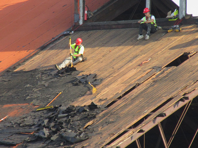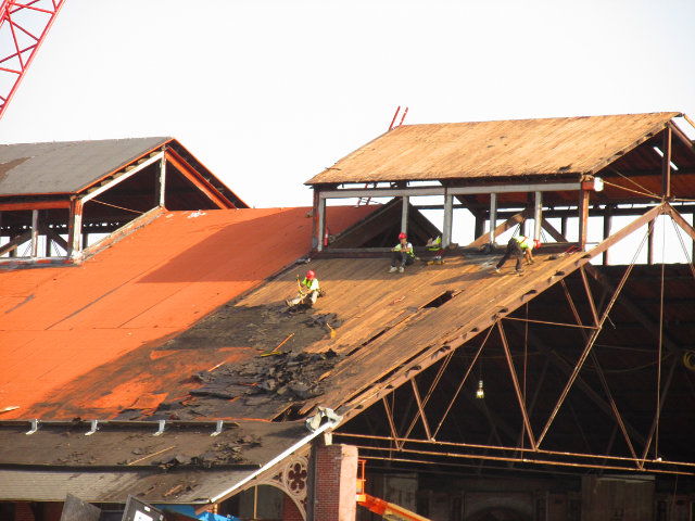 We have recently told you of the work on the Civil War-era train shed at Broad and Carpenter Streets in South Philadelphia. Work continues as roofers scrape away the 20th Century modifications revealing what the building once was in the 19th Century.
