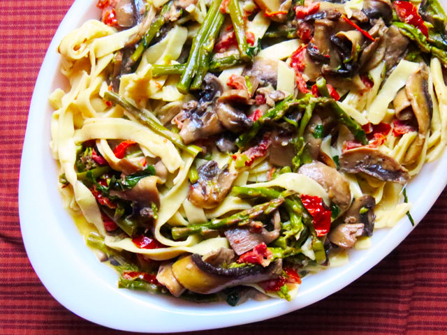 - In a large sauté pan, heat olive oil over medium high heat, add mushrooms, garlic, and asparagus and cook for 3 minutes.
