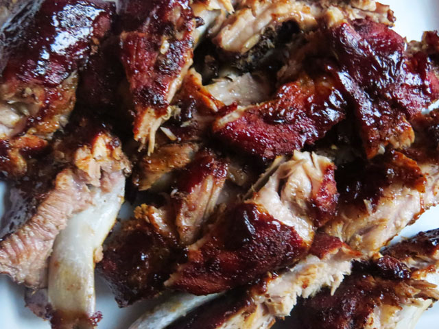 - Open foil, and toss the juices and the fat. Brush the barbecue sauce on both sides of the rack. Increase heat to 350º and place meat side up on baking sheet. Bake for 15 minutes, brush on more barbecue sauce, and bake for an additional 15 minutes.