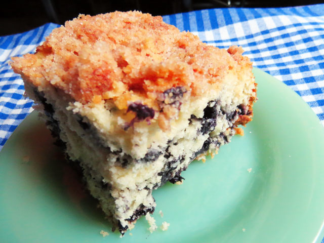 This is the perfect Sunday morning breakfast cake – not too sweet, and loaded with New Jersey blueberries. It’s a quick cake to throw together, and feeds a crowd of 8 to 10.