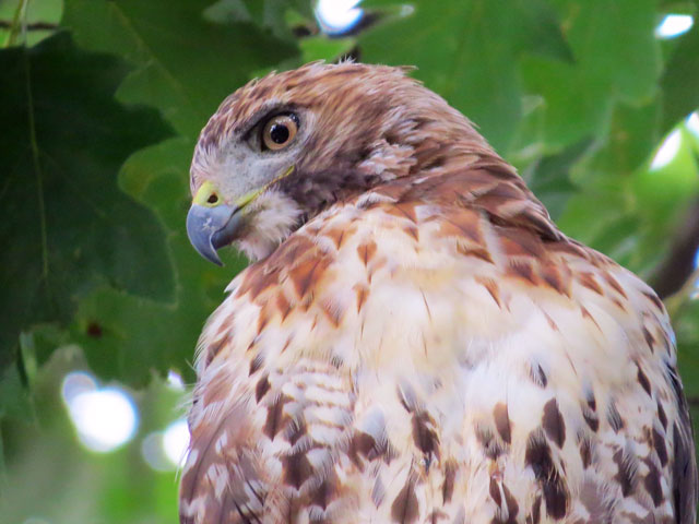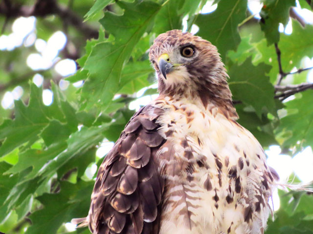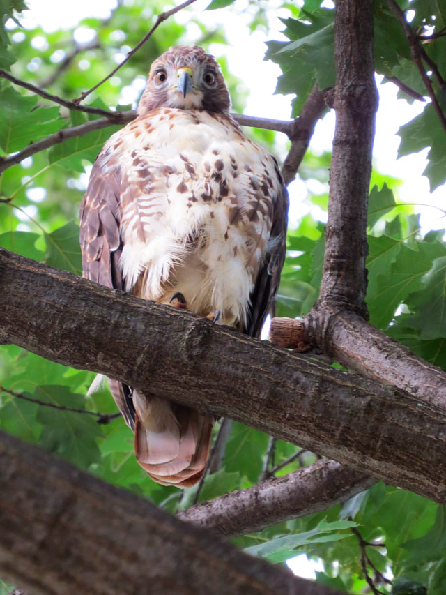 An unusually cool day at the end of July, brought an unusual visitor to our urban landscape. At the Ridgeway Pool on 13th & Carpenter, this fellow was pointed out to me sitting on the branch of one of the mighty shade trees surrounding the city pool. We were lucky to see it, he stayed on his perch for quite a while, affording me the opportunity to take these pictures. Generally, we see squirrels and pigeons in the city, we have seen the occasional possum, but this mighty bird is something we don’t see every day.