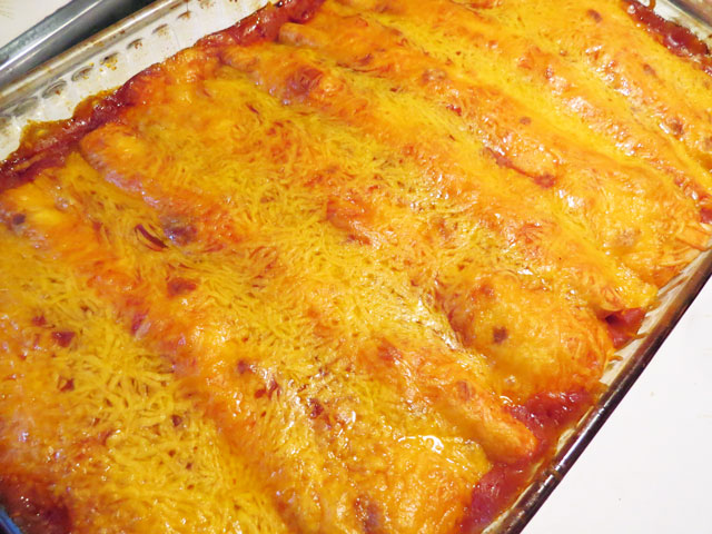 - Spray a 9″ x 13″ baking dish with cooking spray. Cover the bottom of the dish with enchilada sauce.