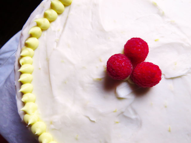 I made this cake for a dear friend’s birthday. A lemon raspberry cake topped with a cream cheese icing with lemon zest. This cake is light, refreshing, studded with raspberries – because everyone loves a cake with raspberry preserves!