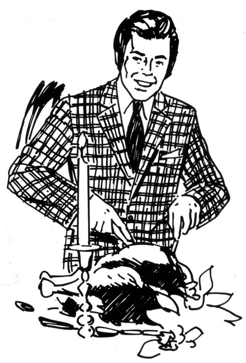 I am also thankful that I work at an old printer that has a terrific stash of vintage clipart. That’s where I scored the beauty above. At one time, these quickly rendered illustrations were impossible to avoid. They appeared over and over again in ads particularly in newspapers. This fellow was probably carving the same bird in advertisements for decades.