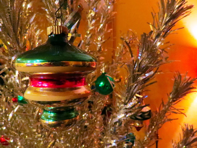 The tree is up. This year we decided to go with the Evergleam aluminum Christmas tree. It was manufactured in Manitowoc, Wisconsin in 1958. They were sold in Montgomery Ward catalogs and a six foot tree like ours went for $100 – a lot of money back then! Aluminum trees were advertised as futuristic, low maintenance, with no messy needles, no allergies, no drying out, and creating a fire hazard like a fresh cut tree. However, stringing lights on them was a safety concern, instead they were lit by a spinning color wheel placed on the floor. We love our shiny tree!