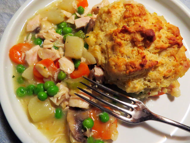 I try to find interesting ways of repurposing our leftover turkey and a pot pie is just the ticket! Except for the buttermilk, most of the ingredients in this dish are things you tend to have on hand after a holiday meal – carrots, potatoes, peas. We’ve also discovered that the leftovers reheat well as lunch the next day, making this a winner at Casa Willceau!
