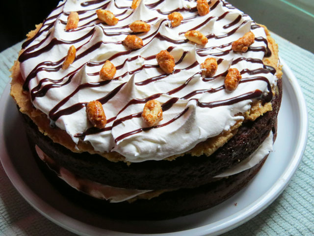 - To assemble, place one of the cake layers on a plate. Spread half of the peanut butter mousse, and drizzle with the chocolate syrup. Place the second layer on top, cover with remaining mousse, spread whipped topping over mousse, drizzle with syrup, and garnish with honey roasted peanuts. Store leftovers in fridge.