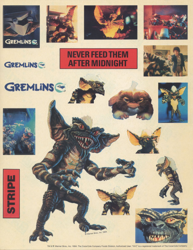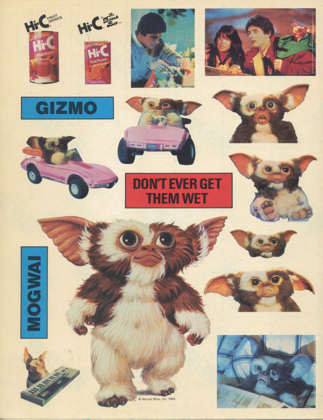 It’s always the way: I am tearing the place apart looking for something which I never find but I uncover something which I had completely forgotten about. In this case I found a couple 0f pages of stickers promoting Joe Dante’s Gremlins (1984) and the fruity goodness of Hi-C!