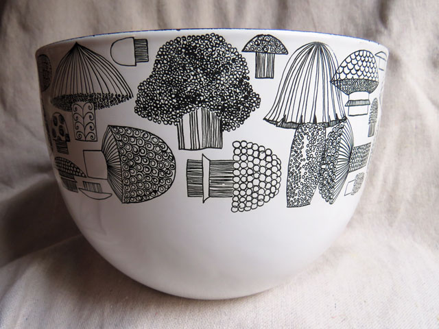 This bowl is an iconic piece of Finnish Mid-Century Modern design. The pen and ink mushrooms are the work of Esteri Tomula, a designer who worked at the Arabia ceramics factory in Helsinki from 1947-1984. This bowl is enameled steel, from the 1960s, and it’s not unusual to see them priced anywhere from $50 to $120, as they’re highly sought after. This was a housewarming gift from my mother, who I guarantee found it at a yard sale and snatched it up for $5 or less. Mom was a magnificent bargain hunter with excellent taste!