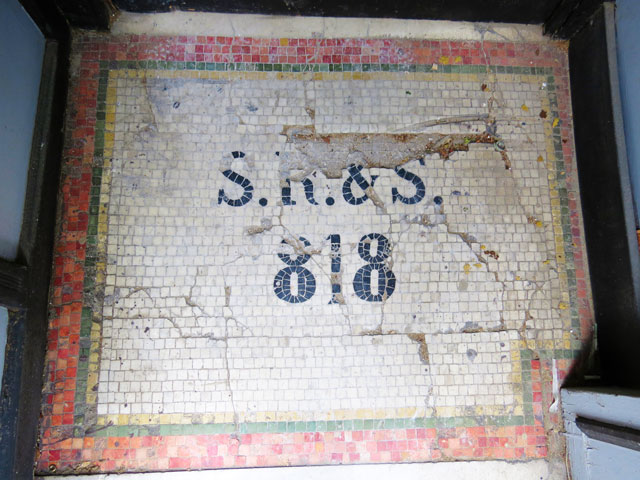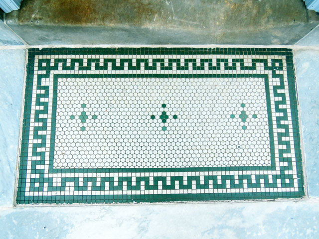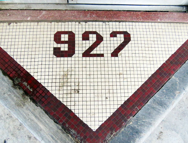 Since I began shooting these tiled entryways, I now find myself running into them all over the neighborhood. This green and white beauty, almost serves as a welcome mat to a private residence, while the two under the cut provide the addresses of businesses. It’s a shame that details like this are considered relics of the past.