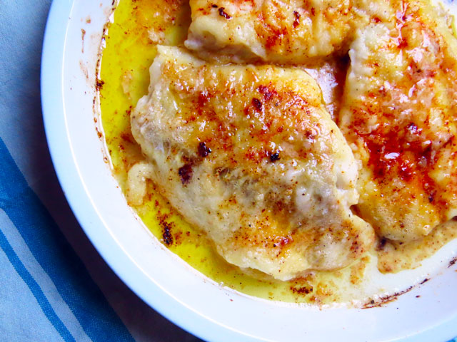 - Dip fish into the butter/ lemon mix – then dredge into the flour on both sides. Place into a baking dish and drizzle the remaining butter/lemon mixture over the filets. Sprinkle with paprika.