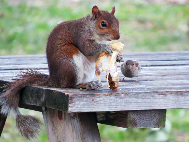 I spotted this brown squirrel at the pool over the weekend, indulging in some leftover chicken. His buddy was patiently waiting to devour the breading that fell on the picnic table. Finger lickin’ good!