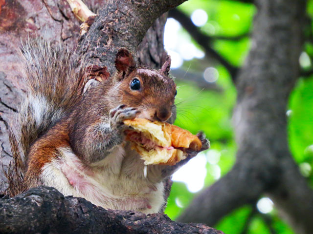 This little fella resides in the giant oak trees that surround our local pool. I recognize him for his brown fur and ratty in the middle tail. The trash cans at the pool provides a smorgasbord for my little rodent gourmand. I’ve seen him nibble on pretzels, Popeye’s chicken, watermelon, and yesterday, a croissant with ham. He’s adventurous, and it’s fun to watch him eat!
