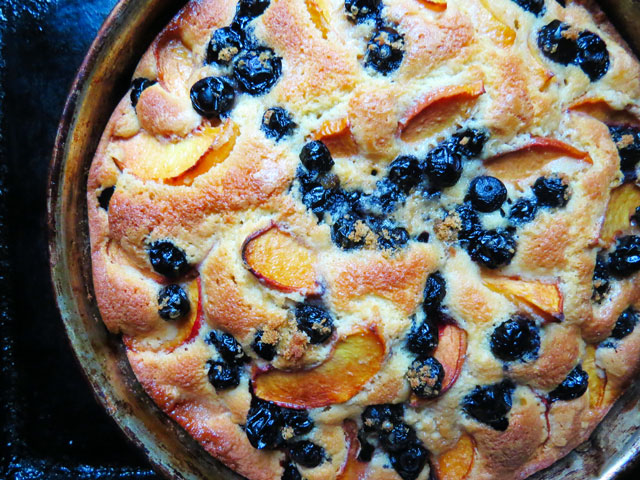 Summer is winding down, and I feel a need to make all of my favorite peach and blueberries recipes while the produce is still available. This cake is what I refer to as a “one pan wonder” – a single layer cake that needs no frosting. Mix up the batter, top with sliced peaches, blueberries, and a sprinkle of brown sugar, and you’re good to go! This cake is wonderful served with a scoop of vanilla ice cream, but also works in the morning with a cup of coffee.