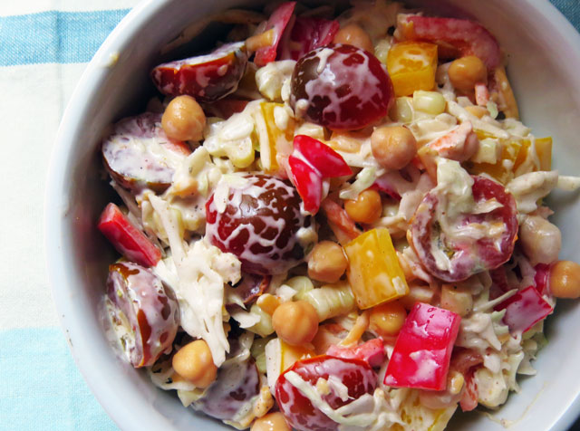 - Add coleslaw, tomatoes, corn, peppers, chick peas, and cheddar cheese in a large bowl, stir to combine.