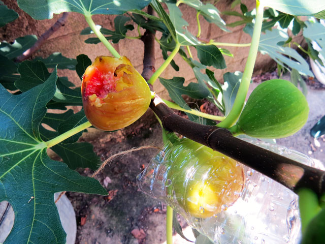 I washed out several empty water bottles, cut them in half, used a hole punch to make holes near the open end of the bottle. I slipped the bottle over a few of the almost ripe figs, and threaded twine through the punched holes to hold it in place. My beloved figs are now bird-proof!