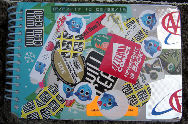 Well, at least there is a llama beneath the stickers. In the back and forth of my commutes, my sketchbooks take a beating so I encrust them with whatever stickers I may find.
