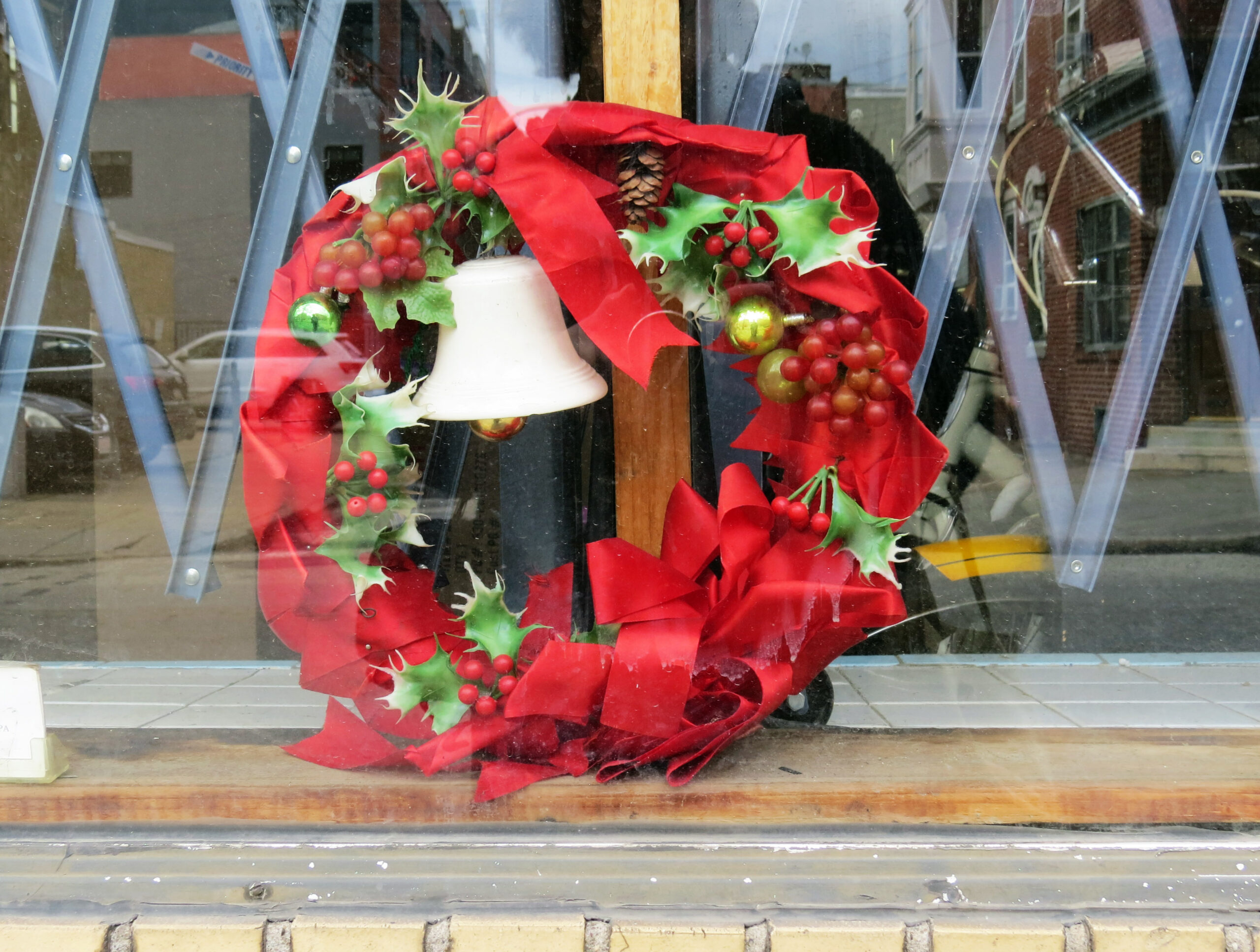This store with a security gate showcases a red ribbon vintage wreath complete with a bell and bunches of grapes that most likely belonged to their Nonna. Down the block, is a gorgeous window box with evergreen branches, holly berries, and stars.