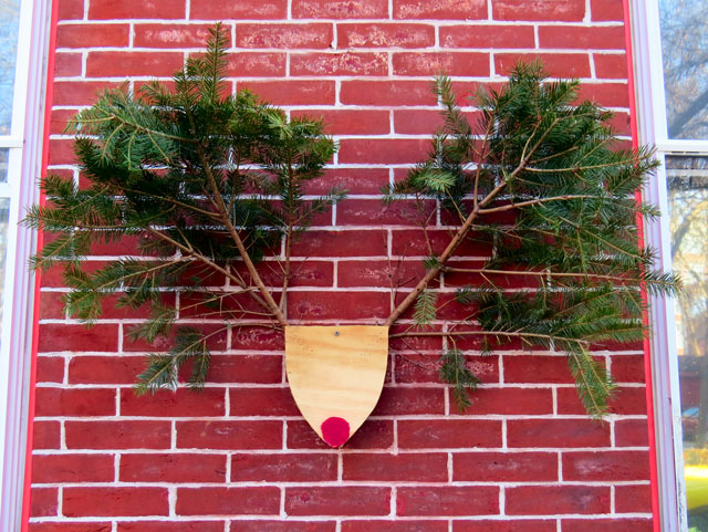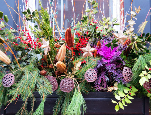 This store with a security gate showcases a red ribbon vintage wreath complete with a bell and bunches of grapes that most likely belonged to their Nonna. Down the block, is a gorgeous window box with evergreen branches, holly berries, and stars.