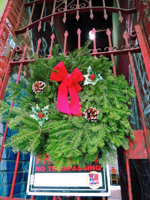 Part of the magic of South Philly at Christmastime, is how they decorate. An ornate, weathered alley gate is adorned with an evergreen wreath.