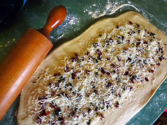 - Spread the dough with garlic, tomatoes, basil, and cheese. The amount of filling ingredients might seem sparse, but too much stuffing will result in a misshapen loaf.