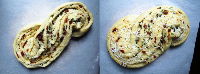- Cut side up, form the log into an “S” shape. Then tuck both of the ends under the center of the bread and pinch together to seal.