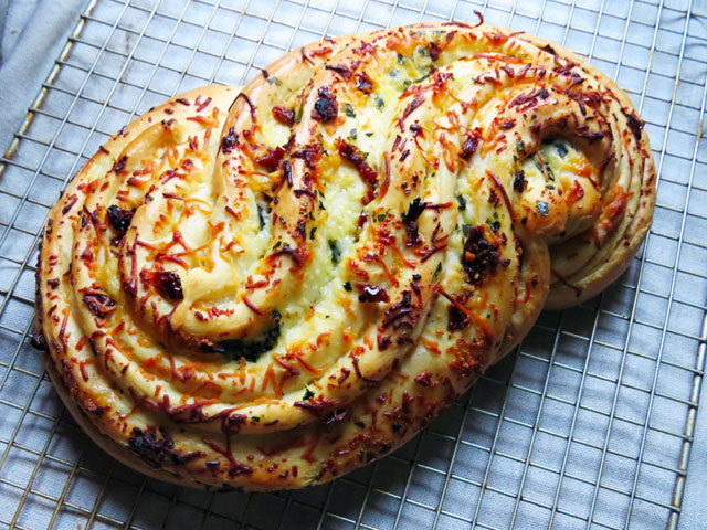 I usually post “Lovin’ from the Oven” on Mondays – but I decided to put this up today because we’re about to have snow/rain/below freezing temperatures around these parts. I figured anyone homebound looking for something to do may want to do a little baking. This is a soft bread, with garlic, sun-dried tomatoes, fresh basil, and mozzarella – and it’s delicious. It also makes fantastic toast!