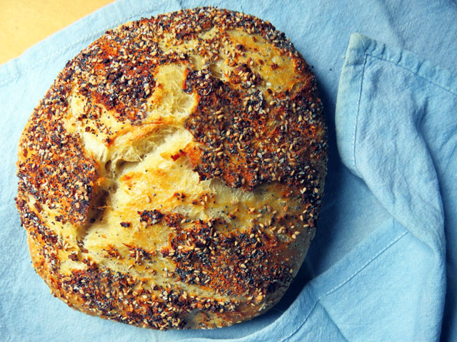 An everything bagel is a bagel that’s topped with poppy seeds, onion flakes, toasted sesame seeds, garlic powder, and kosher salt. This no-knead bread is similar, but the seasoning mix is incorporated into the dough, as well as sprinkled on top. Tasty!