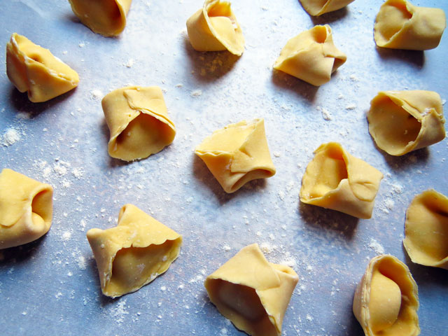 The fellas went to the movies on Saturday, which I took as a perfect opportunity to make tortellini. I have to say, it was a labor intensive process, but at the end of the afternoon, I had a nice sized container of ricotta stuffed pillows for my Valentine’s Day dinner!